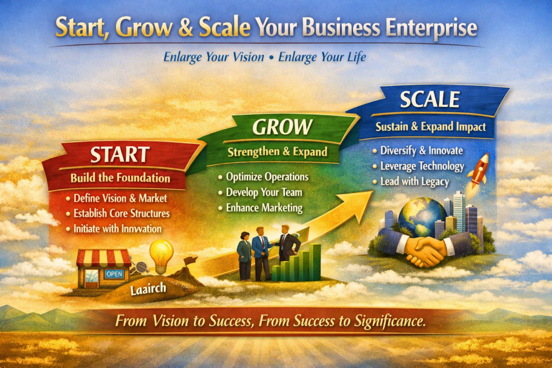 At Enlarjing Steps, the journey of entrepreneurship is viewed as a progressive transformation—from vision to viability, and from growth to sustainable impact. Guided by Dr. Jerry Makokoane’s strategic and coaching expertise, this framework empowers entrepreneurs to build businesses that are purpose-driven, resilient, and scalable. Each stage—Start, Grow, and Scale—represents a distinct phase of development, supported by tailored coaching, strategic planning, and leadership alignment.